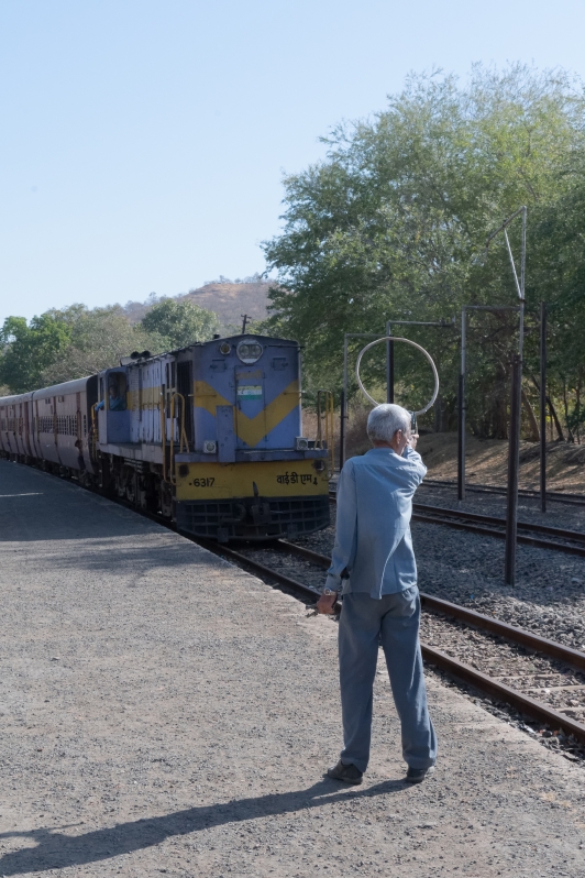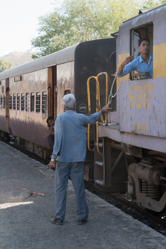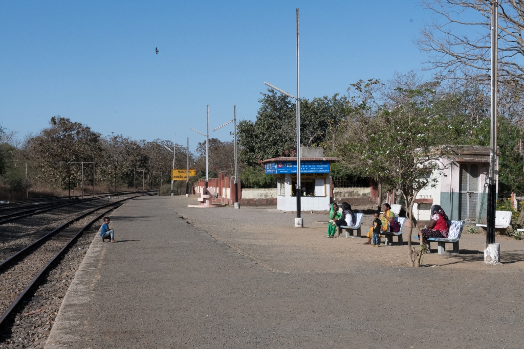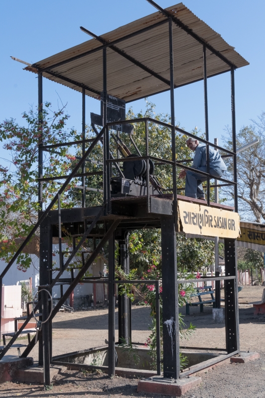 Noch rollen, rumpeln und schaukeln die Schmalspurzüge durch einige Gegenden von Indien. Die Umstellung auf Indische ’normal‘-Breitspur schreitet zügig voran, so dass ich gerne die Gelegenheit nutze noch einmal in einem Lokalzug eine Stunde lang hinter einer unablässig hupenden Diesellok durch Gujarat zu zuckeln. Wie immer fasziniert das vielseitige Leben auf den Plattformen der Stationen, in den gut gefüllten Wagen und neben der Strecke. Die ‚eisenbahnerischen‘ Aspekte wie Steckensicherung, open-air Stellwerk, Fahrplantafeln, etc. studiere ich ausgiebig und halte sie im Bild fest. Die kurze Fahrt bringt uns von Sasan Gir bis nach Talala Junction.