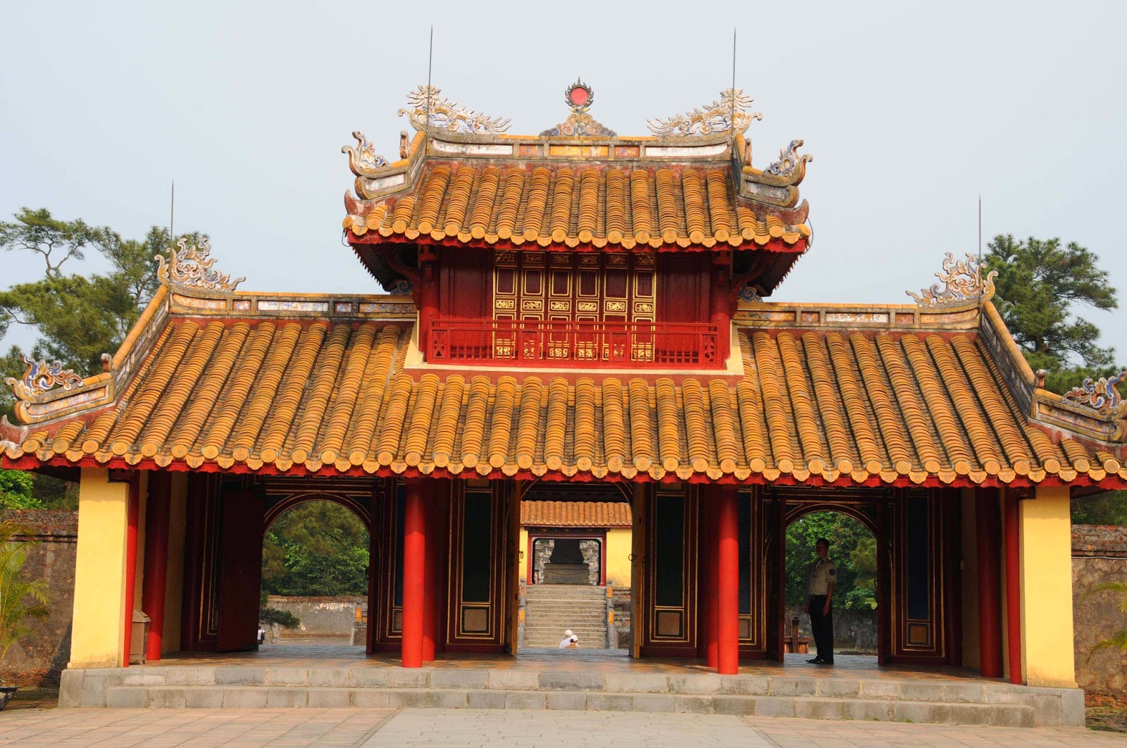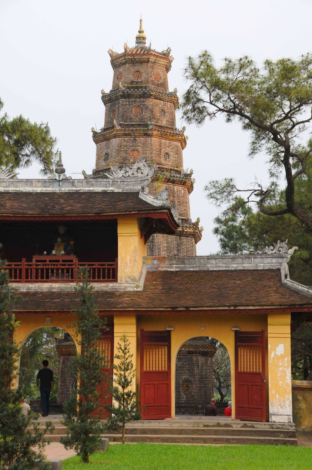 Tien Mu-Pagode von 1601. Der Eingang ist gut bewacht von einem ermahnenden Krieger und der freundlichen Schildkröte.