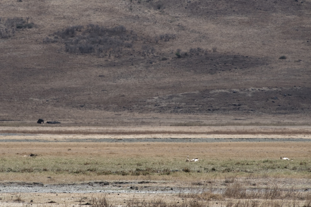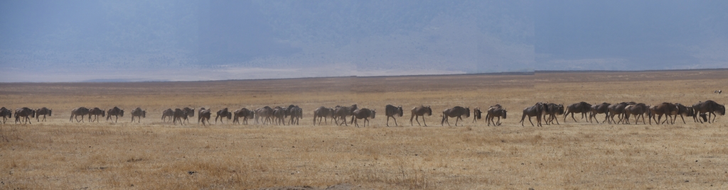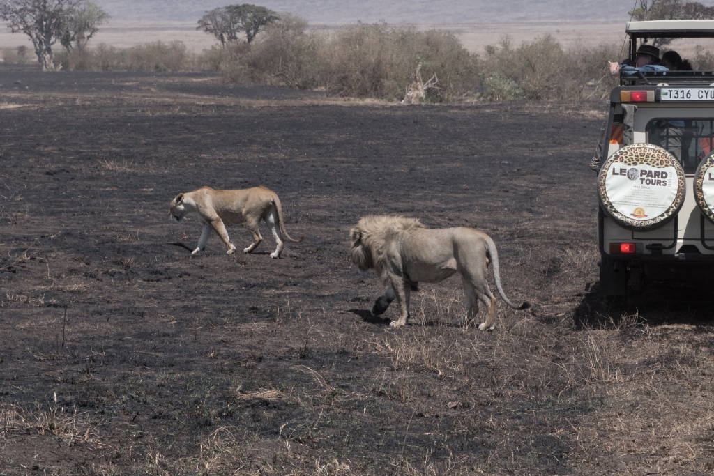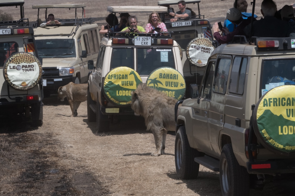 Bei Sonnenuntergang erreichen wir die einzigartige und auch etwas skurrile Ngorongoro Crater Lodge. Auf 2’300 Meter über Meer kriechen wir für die Nacht dankbar unter die wärmende elektrische Decken. Über eine steilen Weg kraxelt unser Land Cruiser am Morgen in den Krater hinunter. Eine Löwin ist mit ihren zwei Jungen auf dem Weg zum Wasserloch zu und von dem auch allerlei andere Tiere unterwegs sind. Ohne Scheu, aber immer wachsam, lässt sie uns ihren Nachwuchs ausgiebig und von Nahem beobachten. In der Ebene im Innern des Kraters stossen wir auf die dichtesten Populationen auf unserer Reise. Die Hippos füllen ihren Pond beinah vollständig aus, Büffel, Wildebeest, Zebras und Antilopen grasen friedlich nebeneinander und auch ein Nashorn lässt sich in der Ferne blicken. Die Löwen stören sich nicht einmal an den 20+ Jeeps die ihnen den Weg über die Strasse versperren und behalten auch im Fokus von 100+ klickenden und surrenden Kameras ihre stoische Haltung – sie sind ja hier die Könige.Along the bumpy dirt road that gets us to the Ngorongoro Crater some young Masai herdspeople make a $ by singing for the tourist. The crater is home to one of the densest wildlife population in Africa. It is just dimply teeming with all races.